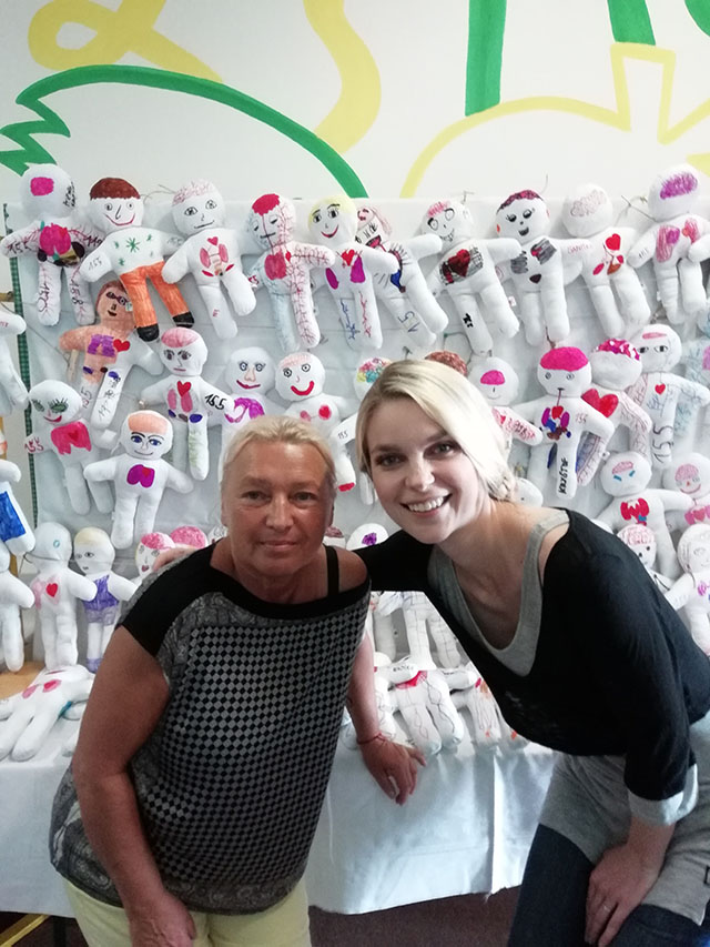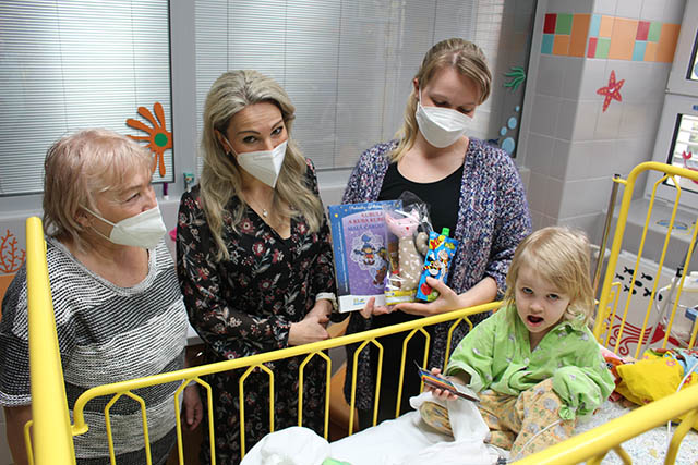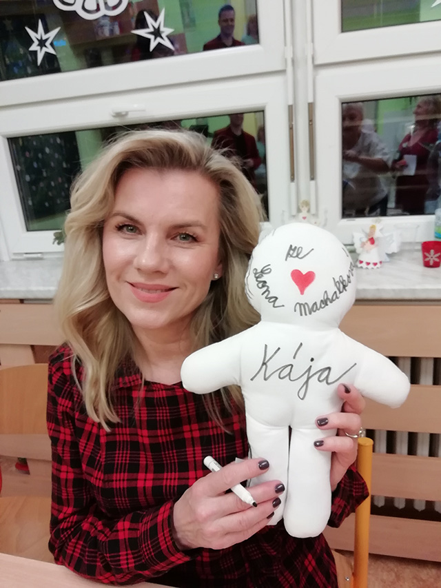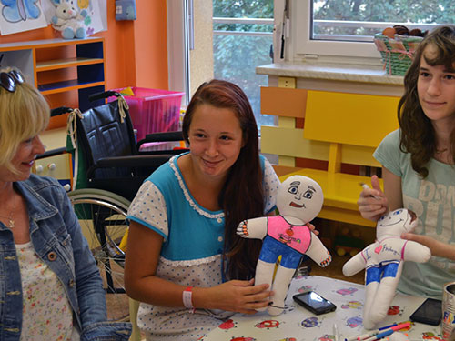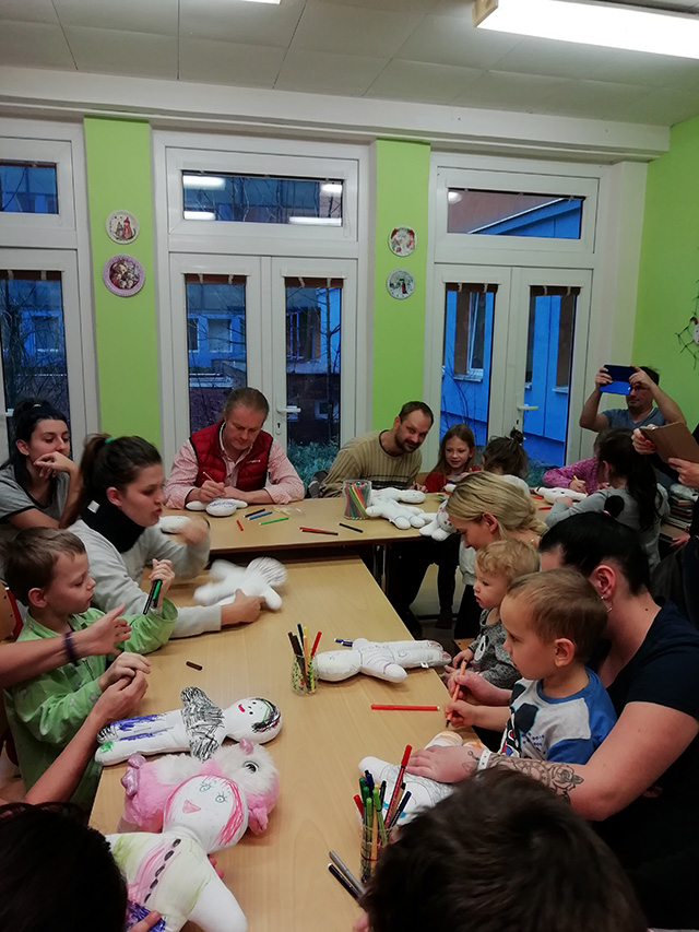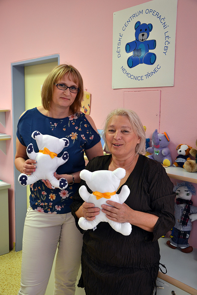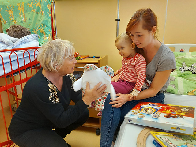Prezidentka sdružení Eva Pastušková rozdává osobně společně s významnými hosty na dětských odděleních nemocnic v moravskoslezském kraji dětem různé dary a bílé látkové panenky, které si mohou podle sebe samy vymalovat.