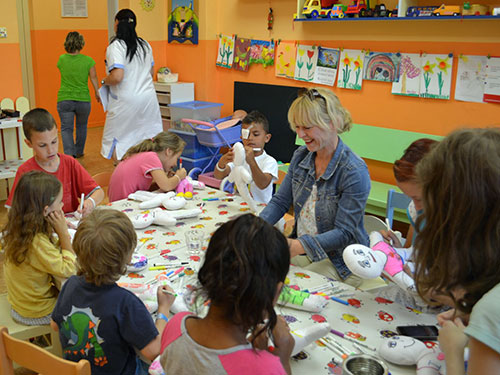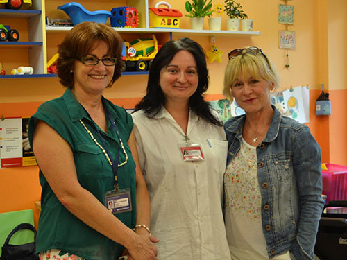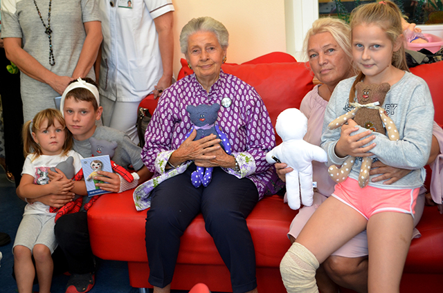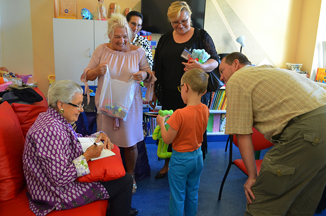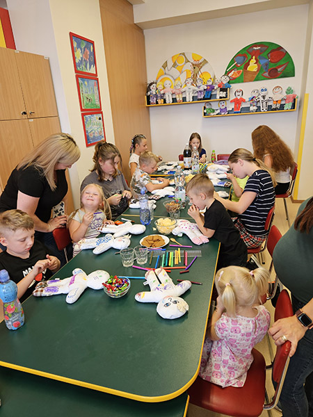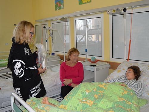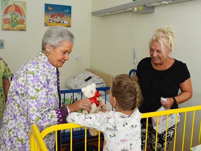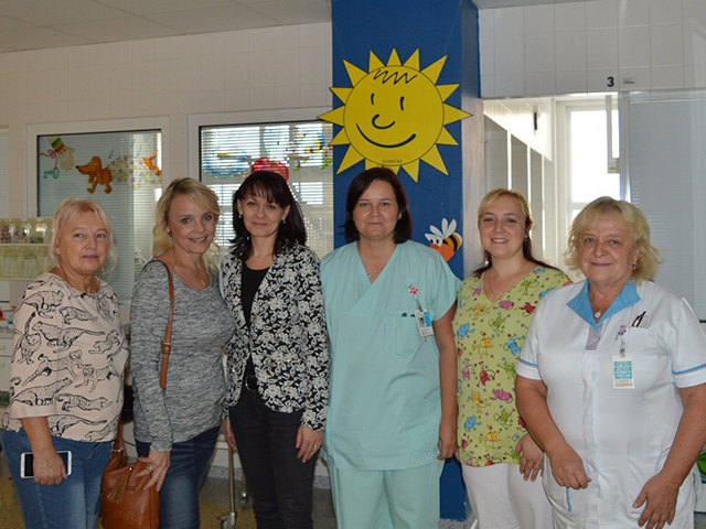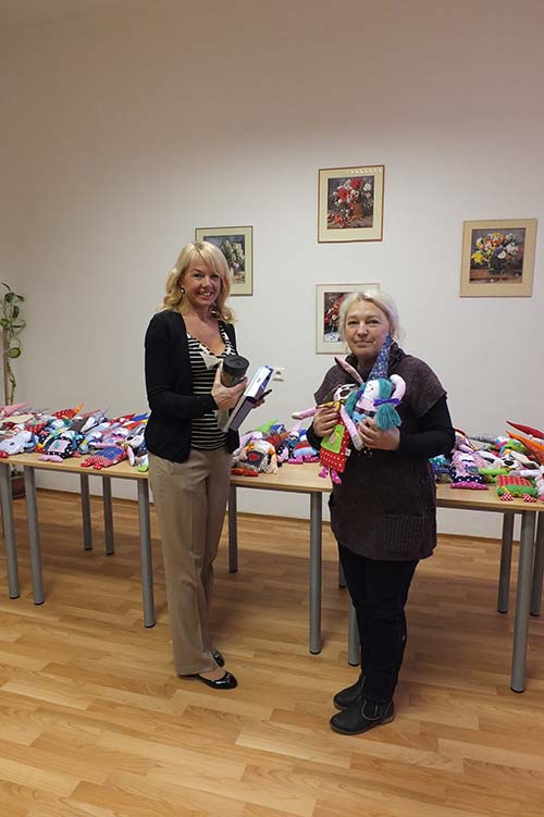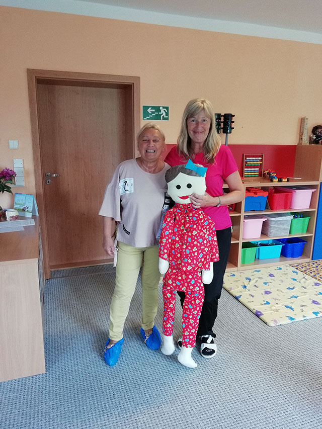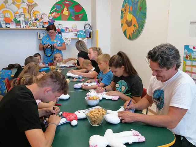 Prezidentka sdružení Eva Pastušková rozdává osobně společně s významnými hosty na dětských odděleních nemocnic v moravskoslezském kraji dětem různé dary a bílé látkové panenky, které si mohou podle sebe samy vymalovat.