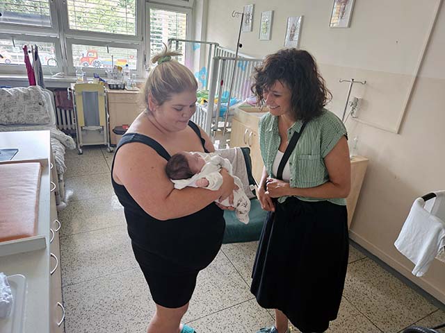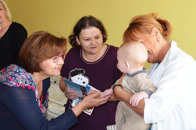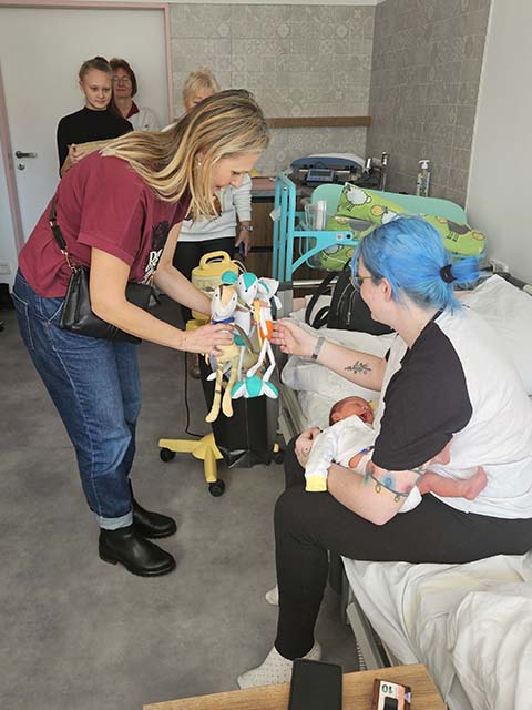 Následovala návštěva gynekologicko-porodního oddělení, které je nově otevřené po celkové rekonstrukci. Pro toto oddělení připravila organizace "Panenka dětem" nové postavičky z vazební věznice Ostrava a háčkované postavičky od žen z věznice Opava. Tyto postavičky jsou novým produktem našeho sdružení a slouží jako trvalý dárek pro novorozence a jejich rodiče. Míša Badinková navštívila čerstvé maminky i tatínky na pokojích, kterým přinesla veselou látkovou postavičku, sladkou odměnu a své povzbuzující slova.