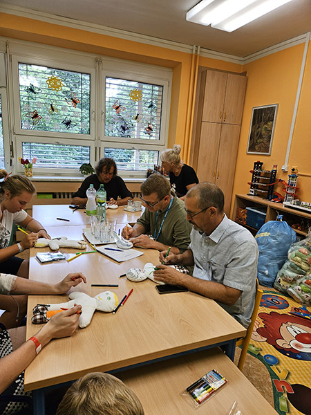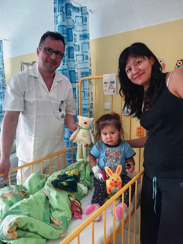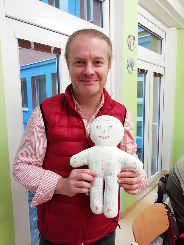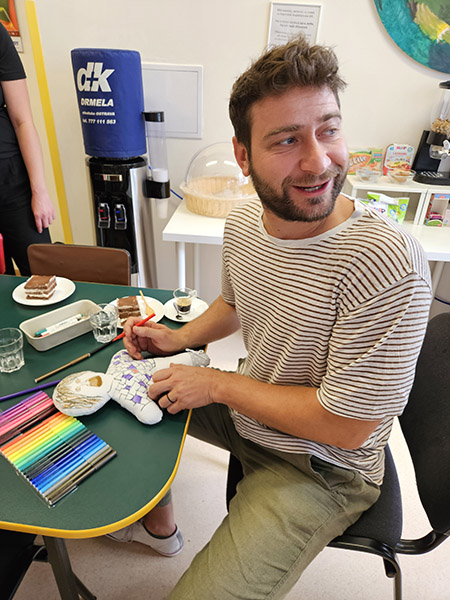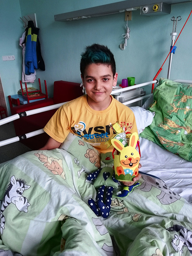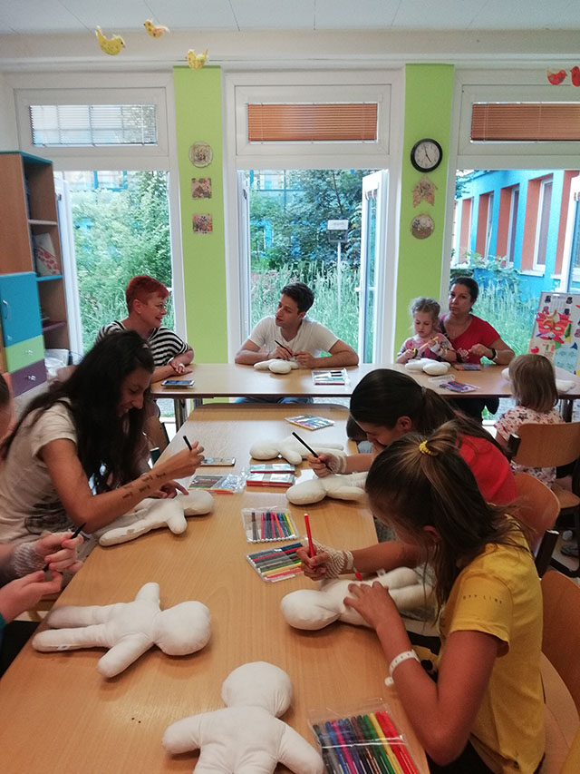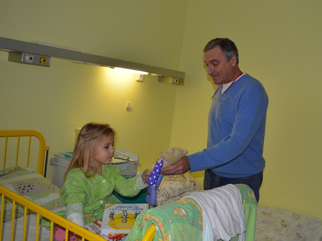 Malí i větší mladí pacienti malovali s Mirkem a Naďou naše látkové panenky, které dětem slouží jako jejich noví kamarádi během pobytu v nemocnici. Na závěr nechyběla i odměna za namalované panenky. Děti dostaly balíček sladkosti, látkového hajánka a malé lego. Zajímavé bylo i veselé povídání z Miroslavem Etzlerem a panem primářem, kteří během návštěvy zjistili, že vlastně chodili na stejné gymnázium. Mirek s humorem jemu vlastním panu primářovi gratuloval k úspěchům ve své odborné praxi, že se očividně mnohem lépe na gymnásiu učil :).
