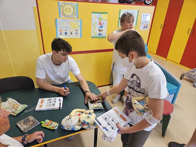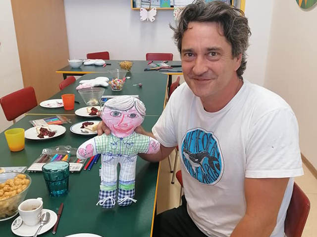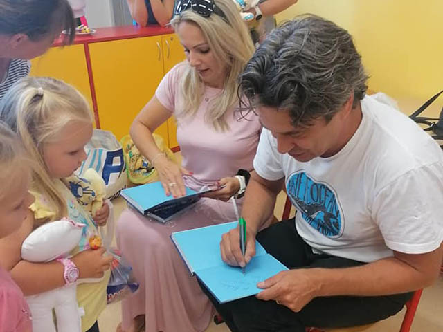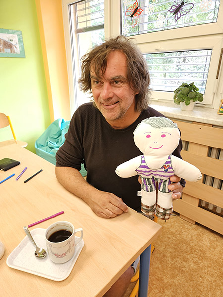 1.7.2023 Roman Zach rozdával a kreslil panenky na dětském oddělení v nemocnici Havířov...