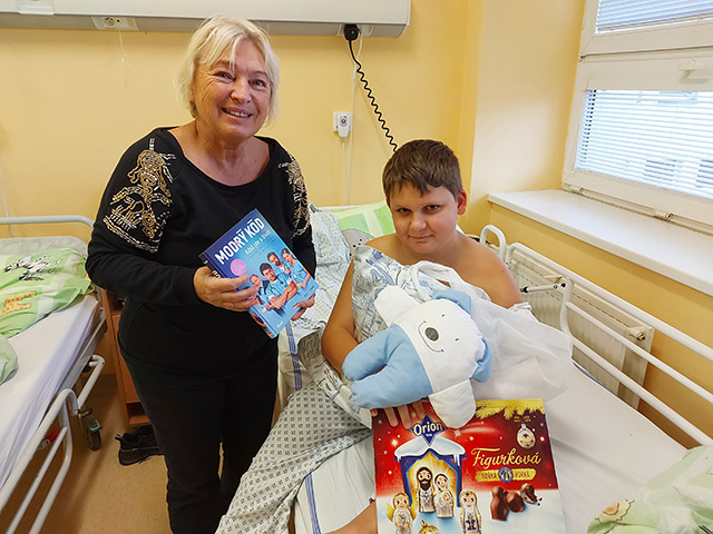 Zkrátka nepřišli ani pacienti, kteří ze zdravotních důvodů museli zůstat na lůžku. Míša Badinková procházela jednotlivé pokoje a přínášela do nich kromě panenek, polštářků "Hajánků", sladkostí i hromadu dobré nálady.