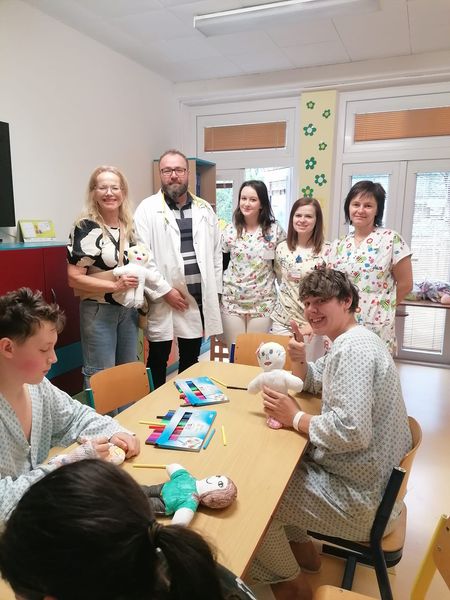 Ve středu 3.8.2022 jsme navštívili dětské odd. nem. Ostrava Fifejdy s populární hercem Ladislavem Hamplem ,který si udělal čas a přišel potěšit nemocné děti.Předali jsme dětem a dětskému odd. naše nové panenky spolu s Lindou Filuszovou (zástupcem Innogy našim váženým sponzorem). Pan Hampl maloval s dětmi panenky ,které pak za odměnu dostali od nás dárečky , děti,které nemohly na herně malovat panenky jsme navštívíli na pokojích.