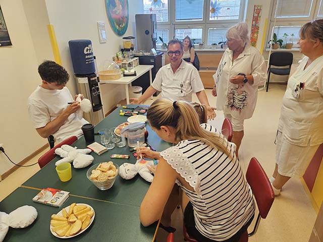 Jak jak je zvykem na tomto oddělení, přišli do společenské místnosti malí i větší pacienti dětského oddělení namalovat si svou vlastní panenku společně se známou osobností. Nechyběly ani dárečky a štědrá velikonoční nadílka, která však bude dělat větší radost až doma po zlepšení zdravotního stavu.